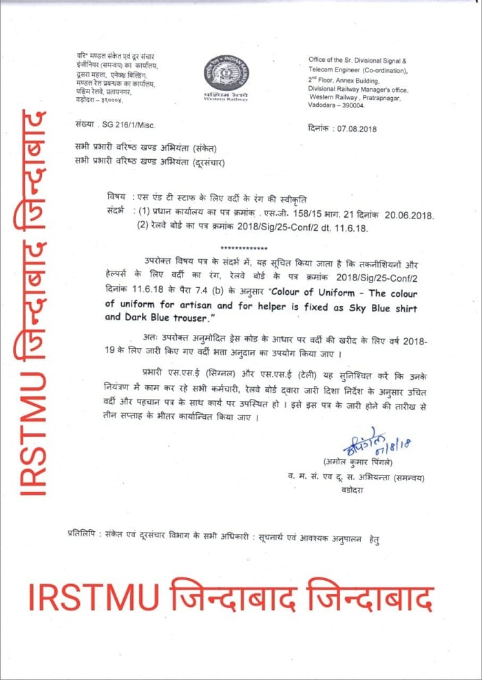 एस.एंड टी स्टाफ के लिए वर्दी के रंग की स्वीकृति