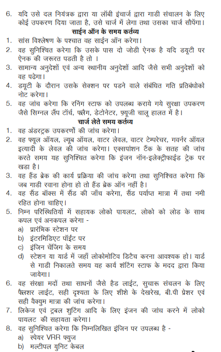 - शेड से इंजिन निकालते समय, पहले दल से अधिकार में लेते समय, निष्क्रिय इंजिनों को अधिकार में लेते समय इंजिनों के परिस्थिती संबंधित नियम एवं प्रक्रिया की जानकारी रखनी होगी.