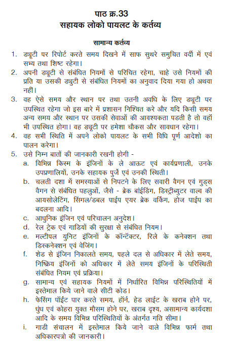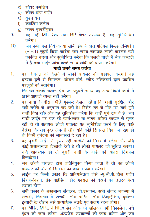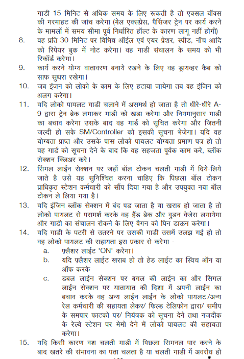 - सामान्य अनुदेशों एवं अन्य स्थानीय अनुदेशों आदि जैसे सभी अनुदेशों को वह पढ़ेगा। ड्यूटी के दौरान उसके सेक्शन पर पडने वाले संबंधित गति प्रतिबंधोको नोट करेगा।
