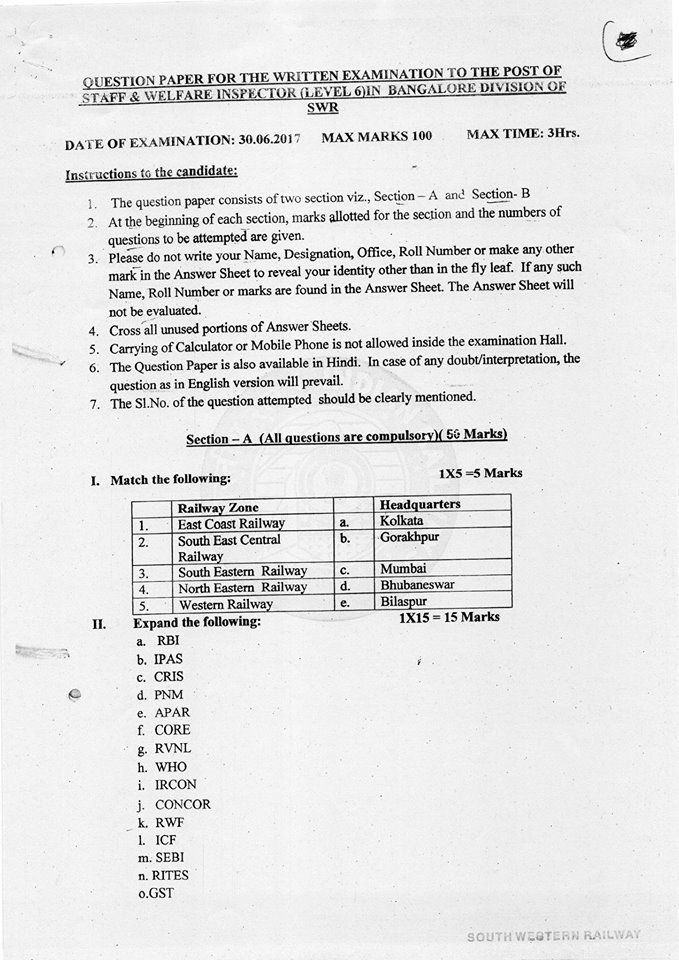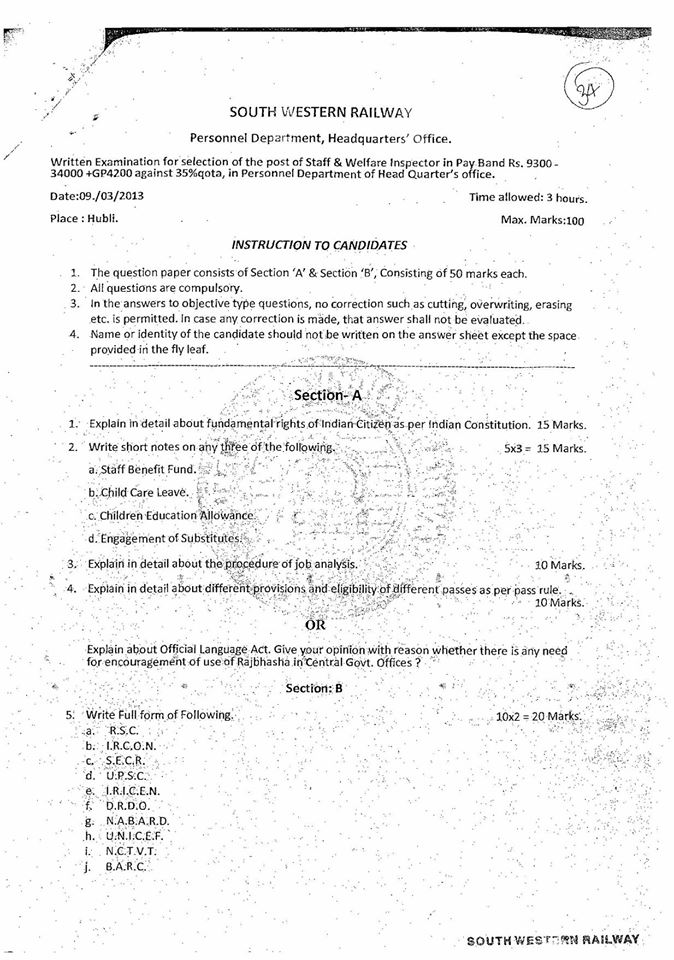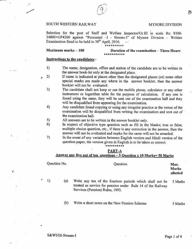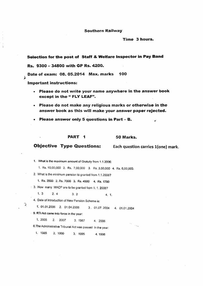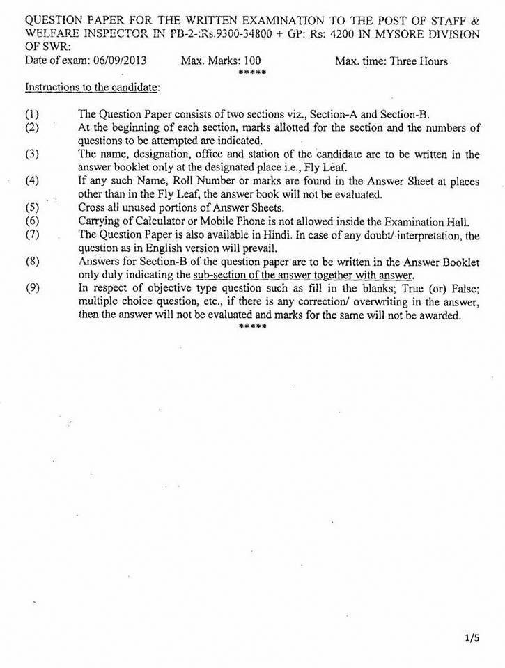 Q PAPER – SELECTION OF STAFF & WELFARE INSPECTOR – SWR – 2011