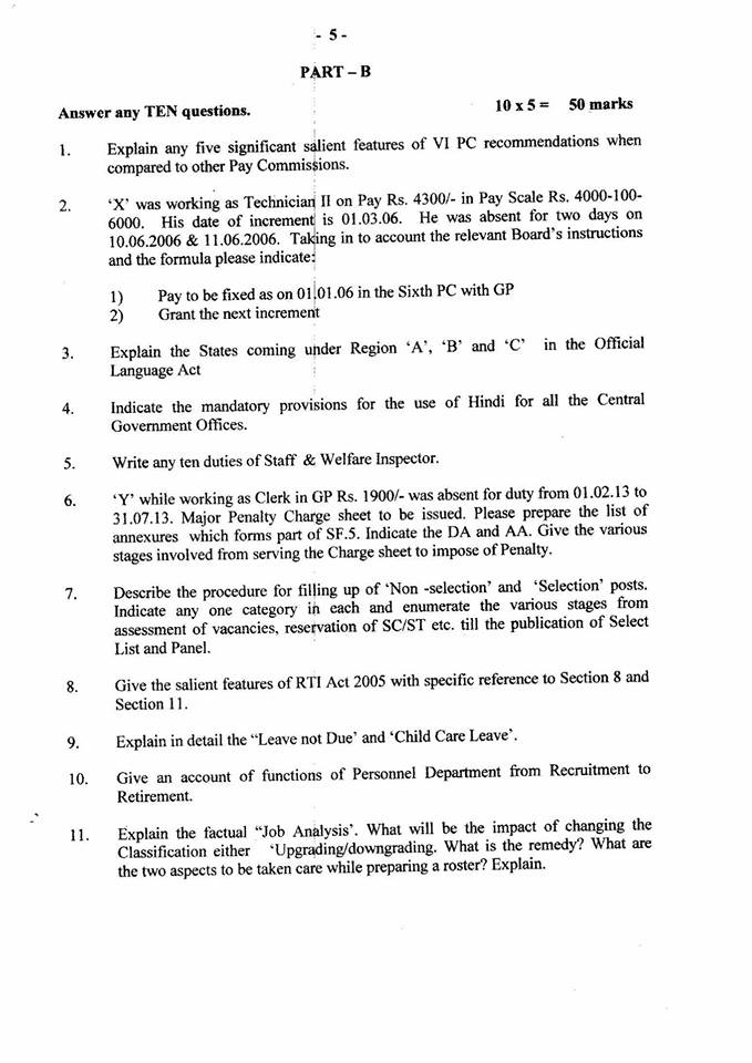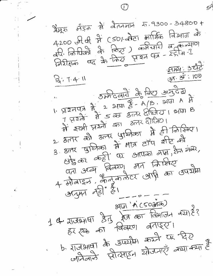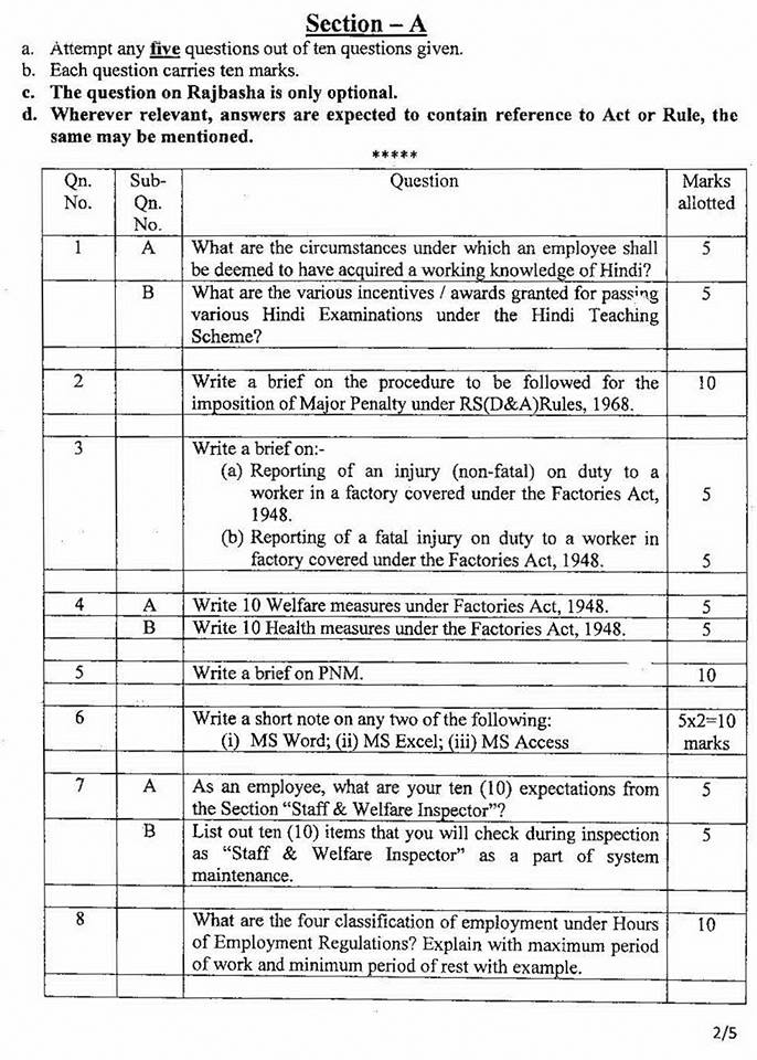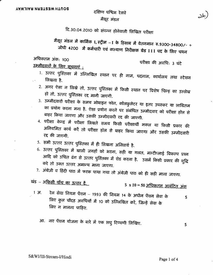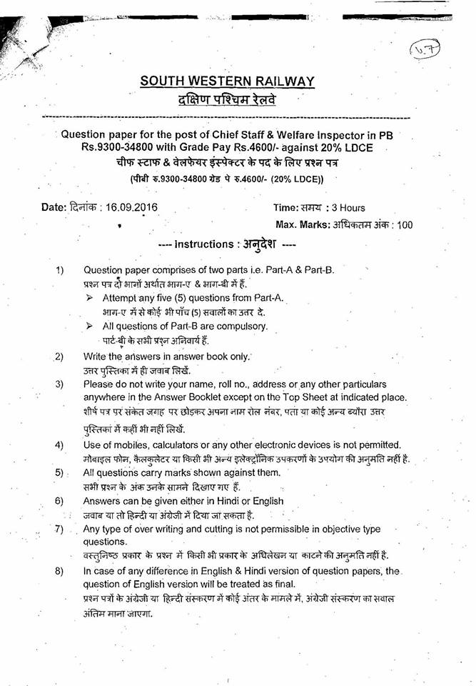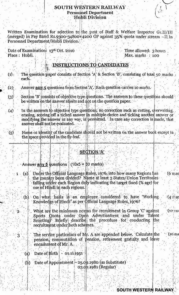 Q PAPER – SELECTION OF STAFF & WELFARE INSPECTOR – SWR – 2011